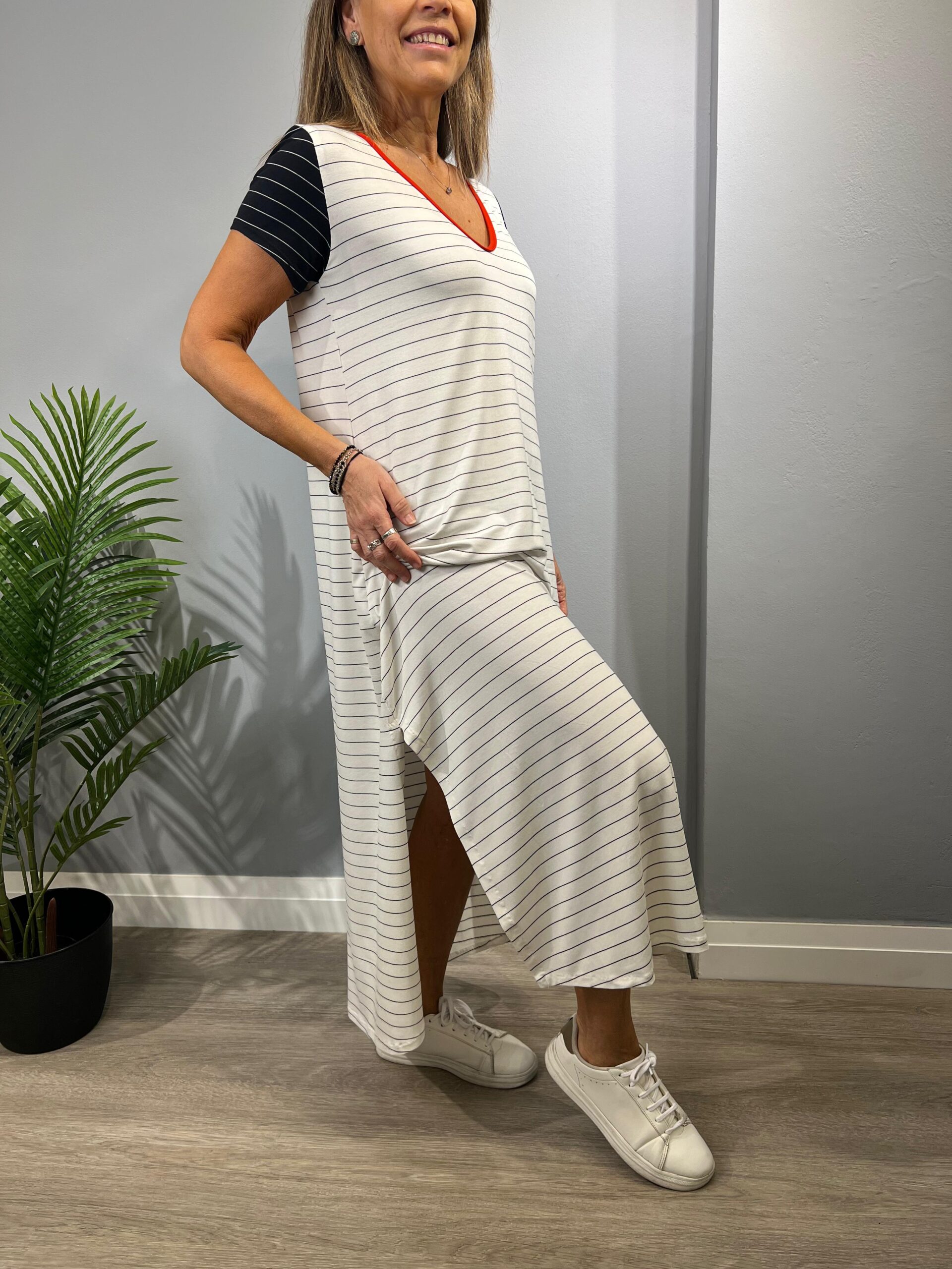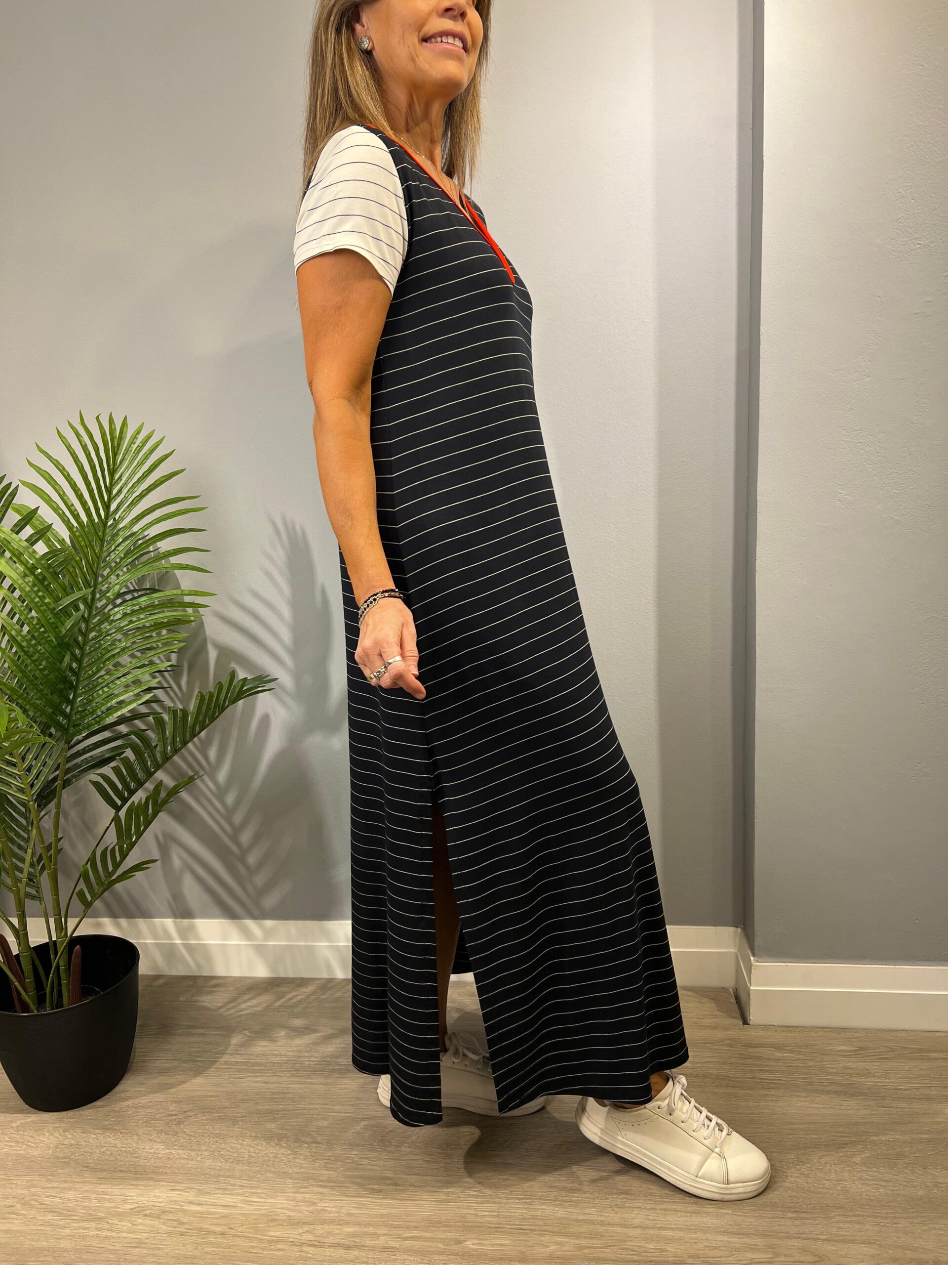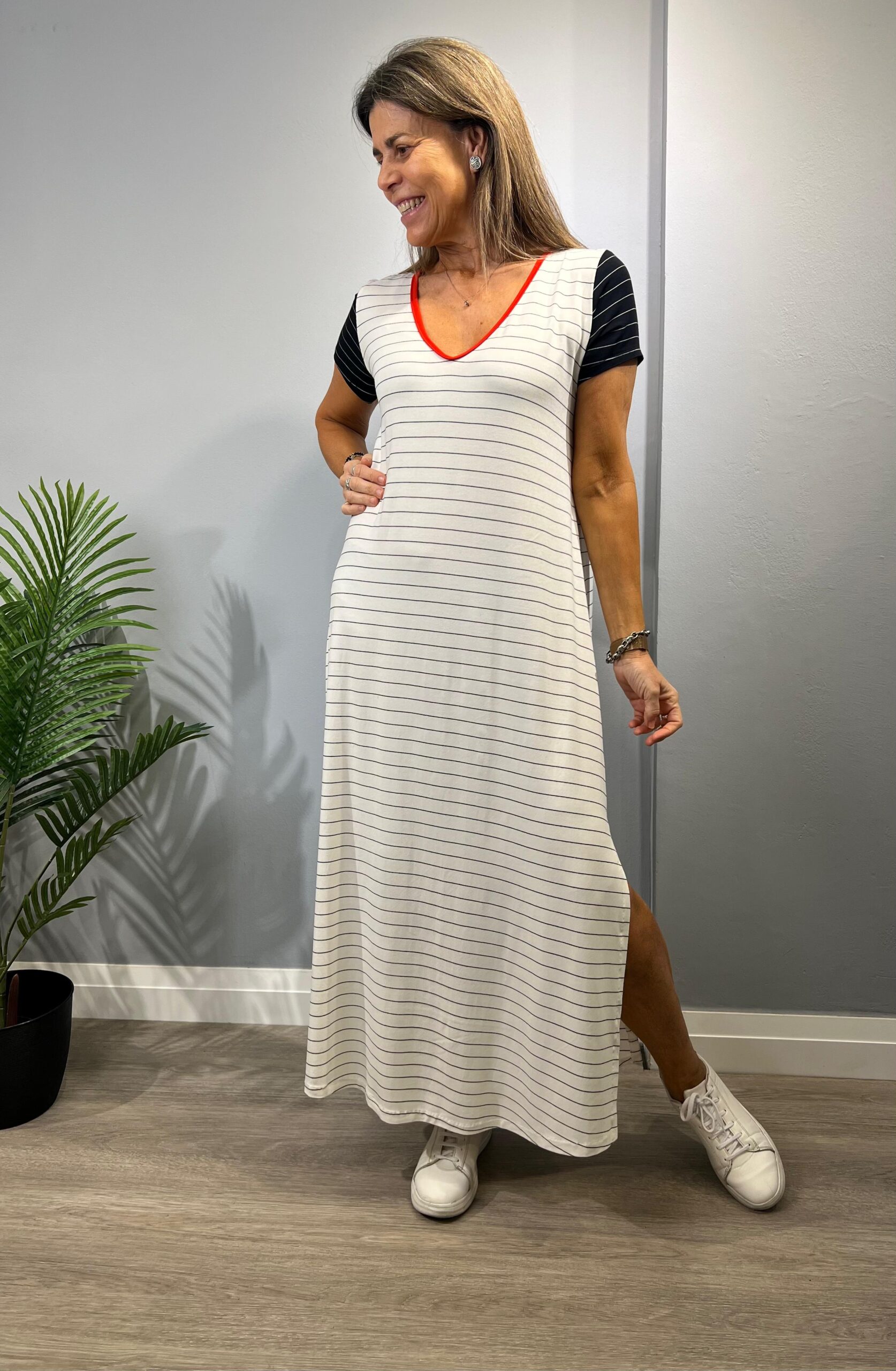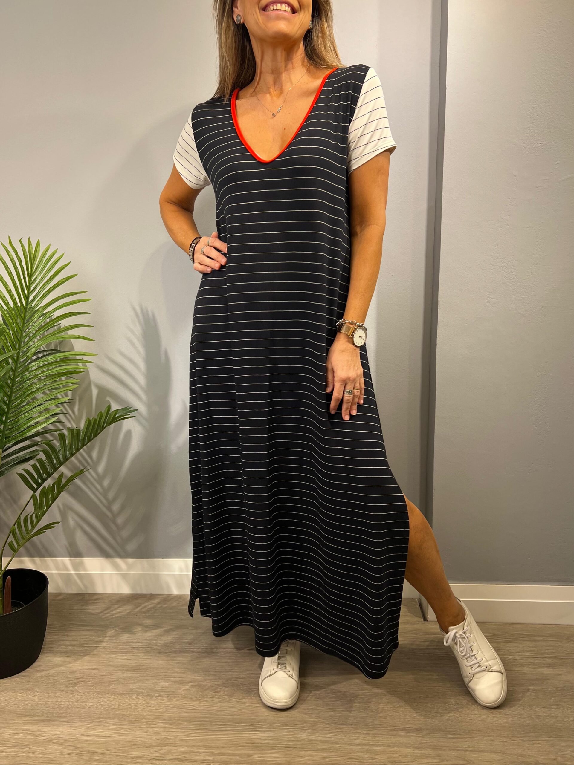 La modelo mide 168cm y usa talle 2